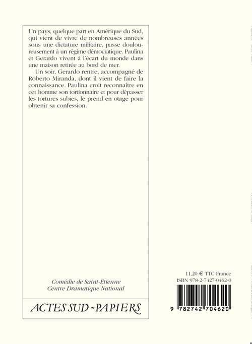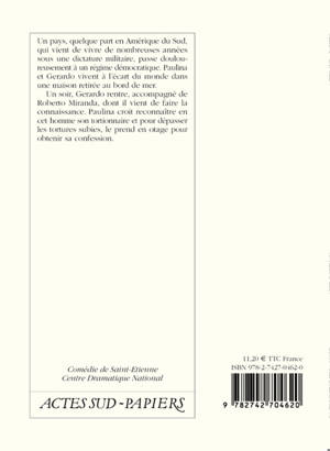 Un soir, Gerardo rentre, accompagné de Roberto Miranda, dont il vient de faire la connaissance. Paulina croit reconnaître en cet homme son tortionnaire et pour dépasser les tortures subies, le prend en otage pour obtenir sa confession.