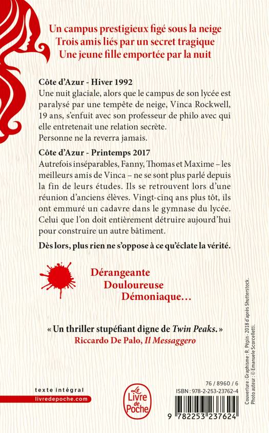 Une jeune fille emportée par la nuitCôte d’Azur - Hiver 1992Une nuit glaciale, alors que le campus de son lycée est paralysé par une tempête de neige, Vinca Rockwell, 19 ans, s’enfuit avec son professeur de philo avec qui elle entretenait une relation secrète. Personne ne la reverra jamais.