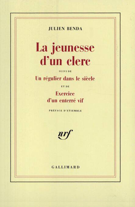 Lorsque Paulhan, contre l'avis de Gide, qui n'aimait pas Benda (lequel le lui rendait bien) publia dans La Nouvelle Revue Française cette Jeunesse d'un clerc qui enchanta notre jeunesse, il prouva une fois de plus la sûreté de son goût et que, contrairement à la légende, l'esprit de chapelle ne le possédait pas. Puis ce fut Un régulier dans le siècle ; plus tard, sous l'Occupation, l'Exercice d'un enterré vif ; enterré vif par les lois racistes qui frappèrent ce juif pourtant fort peu enclin à célébrer le judaïsme ; laïc parfait qu'il se voulait au milieu de toutes ses religions.