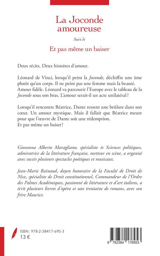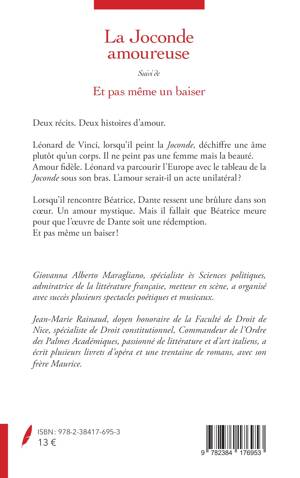 Deux récits. Deux histoires d'amour. Léonard de Vinci, lorsqu'il peint la Joconde, déchiffre une âme plutôt qu'un corps. Il ne peint pas une femme mais la beauté. Amour fidèle. Léonard va parcourir l'Europe avec le tableau de la Joconde sous son bras. L'amour serait-il un acte unilatéral ? Lorsqu'il rencontre Béatrice, Dante ressent une brûlure dans son coeur. Un amour mystique. Mais il fallait que Béatrice meure pour que l'oeuvre de Dante soit une rédemption. Et pas même un baiser !