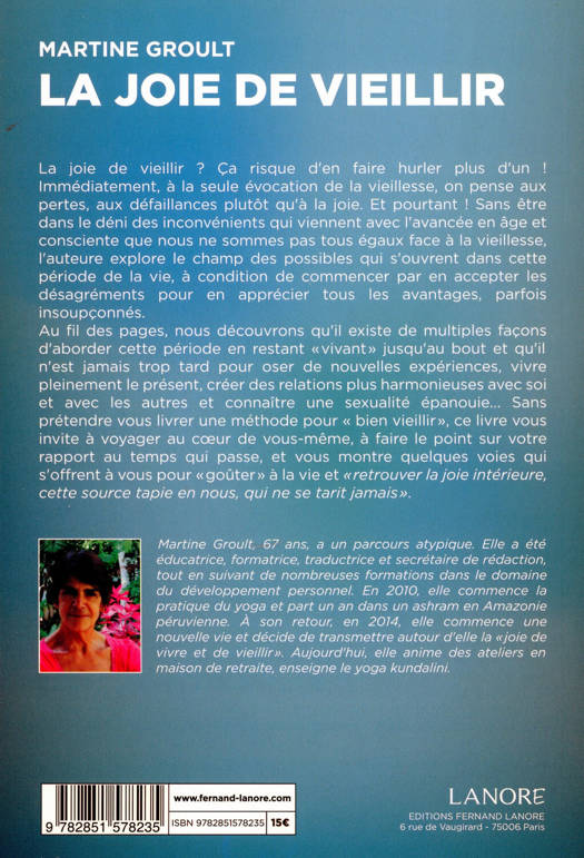 La joie de vieillir ? Ça risque d'en faire hurler plus d'un ! Immédiatement, à la seule évocation de la vieillesse, on pense aux pertes, aux défaillances plutôt qu'à la joie. Et pourtant ! Sans être dans le déni des inconvénients qui viennent avec l'avancée en âge et consciente que nous ne sommes pas tous égaux face à la vieillesse, l'auteure explore le champ des possibles qui s'ouvrent dans cette période de la vie, à condition de commencer par en accepter les désagréments pour en apprécier tous les avantages, parfois insoupçonnés. Au fil des pages, nous découvrons qu'il existe de multiples façons d'aborder cette période en restant « vivant » jusqu'au bout et qu'il n'est jamais trop tard pour oser de nouvelles expériences, vivre pleinement le présent, créer des relations plus harmonieuses avec soi et avec les autres et connaître une sexualité épanouie... Sans prétendre vous livrer une méthode pour « bien vieillir », ce livre vous invite à voyager au coeur de vous-même, à faire le point sur votre rapport au temps qui passe, et vous montre quelques voies qui s'offrent à vous pour « goûter » à la vie et « retrouver la joie intérieure, cette source tapie en nous, qui ne se tarit jamais ».