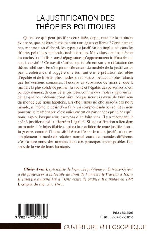 Qu'est-ce qui peut justifier cette idée, dépourvue de la moindre évidence, que les êtres humains sont tous égaux et libres ? Certainement pas, montre-t-on d'abord, les types de justification implicites dans les théories politiques et morales traditionnelles. Mais alors, comment éviter la conclusion nihiliste, aussi répugnante qu'apparemment irréfutable, qui surgit aussitôt ? Ce travail s'articule précisément sur une réfutation des thèses nihilistes. En s'inspirant largement du modèle de la justification par la cohérence, il suggère une tout autre interprétation des idées d'égalité et de liberté, plus modeste, mais aussi beaucoup plus robuste que les versions courantes. Il essaye en substance de montrer que la manière la plus solide de justifier la liberté et l'égalité des personnes, c'est, paradoxalement, de considérer ces idées comme de simples suppositions : celles que nous devons construire lorsque nous essayons de faire sens du monde que nous habitons. En effet, nous ne choisissons pas notre monde, ni même le désir d'en faire un compte-rendu sensé. Et si nous pouvons le réaménager, c'est uniquement en partant des principes qu'il nous inspire lorsque nous essayons d'en faire sens. Il y a cependant un coût à justifier ainsi la liberté et l'égalité. Si la justification a lieu dans un monde – l'« Injustifiable » qui est la condition de toute justification –, la guerre, comme l'impossibilité manifeste de toute justification, est simplement le mode de relation normal entre des mondes différents, c'est-à-dire entre des mondes dont des principes incompatibles font sens de la vie de leurs habitants.