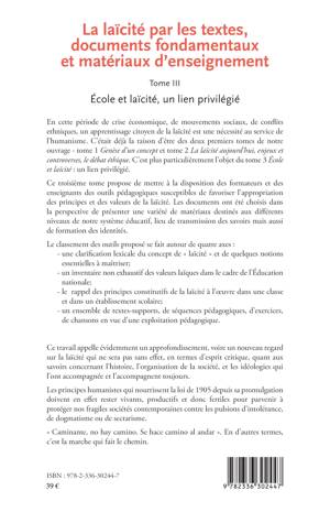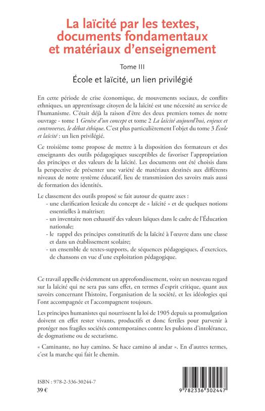 En cette période de crise économique, de mouvements sociaux, de conflits ethniques, un apprentissage citoyen de la laïcité est une nécessité au service de l'humanisme. Après le tome 1 et le tome 2, le tome 3 s'attache plus particulièrement au lien entre école et laïcité. Il propose et met à disposition des formateurs et enseignants des outils pédagogiques susceptibles de favoriser l'appropriation des principes et des valeurs de la laïcité.