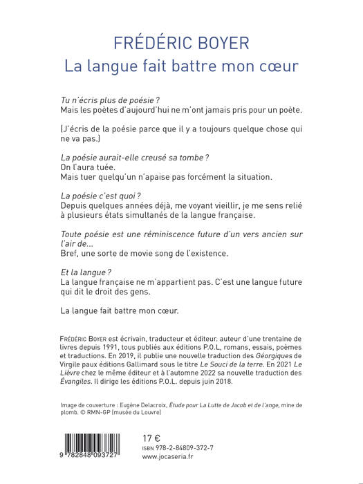 J’écris aujourd’hui de la poésie parce que la situation de la littérature contemporaine ne me convient pas. <br /> J’écris aujourd’hui de la poésie parce que j’aurais besoin d’une bonne psychothérapie (me dit-on) — ce qui est une mauvaise raison.<br /> J’écris aujourd’hui de la poésie parce que tout autour de nous parle d’un autre monde et nous ne le comprenons pas.<br /> J’écris aujourd’hui de la poésie parce que les ombres s’élèvent et que je n’ose plus rentrer chez moi.