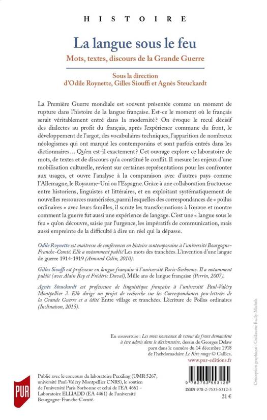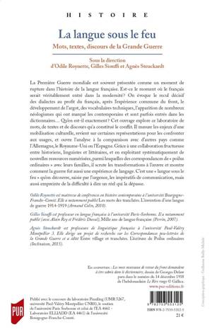 La Première Guerre mondiale est souvent présentée comme un moment de rupture dans l'histoire de la langue française. Est-ce le moment où le français serait véritablement entré dans la modernité? On évoque le recul décisif des dialectes au profit du français, après l'expérience commune du front, le développement de l'argot, des vocabulaires techniques, l'apparition de nombreux néologismes qui ont marqué les contemporains et sont parfois entrés dans les dictionnaires... Qu'en est-il exactement ? Cet ouvrage explore ce laboratoire de mots, de textes et de discours qu'a constitué le conflit. Il mesure les enjeux d'une mobilisation culturelle, revient sur certaines représentations pour les confronter aux usages, et ouvre l'analyse à la comparaison avec d'autres pays comme l'Allemagne, le Royaume-Uni ou l'Espagne. Grâce à une collaboration fructueuse entre historiens, linguistes et littéraires, et en exploitant systématiquement de nouvelles ressources numérisées, parmi lesquelles des correspondances de "poilus ordinaires" avec leurs familles, il scrute les transformations à l'oeuvre et montre comment la guerre fut aussi une expérience de langage. C'est une "langue sous le feu" qu'on découvre, saisie par l'urgence, les impératifs de communication, mais aussi empreinte de la difficulté à dire un réel qui la dépasse.