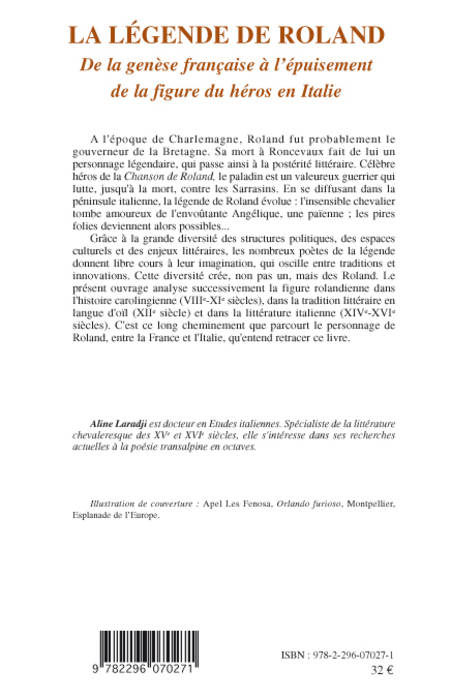 A l'époque de Charlemagne, Roland fut probablement le gouverneur de la Bretagne. Sa mort à Roncevaux fait de lui un personnage légendaire. Grâce à la grande diversité des structures politiques, des espaces culturels et des enjeux littéraires, les nombreux poètes de la légende donnent libre cours à leur imagination, qui oscille entre traditions et innovations. Le présent ouvrage analyse successivement la figure rolandienne dans l'histoire carolingienne (VIII- XIe siècles), dans la tradition littéraire en langue d'oïl (XIIe siècle) et dans la littérature italienne (XIVe-XVIe siècles).