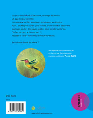 Un jour, il y eut un immense incendie dans la forêt. Les animaux terrifiés assistaient impuissants au désastre. Tous, sauf le petit Colibri qui s'activait, allant chercher quelques gouttes avec son bec pour les jeter sur le feu. "Je fais ma part", répétait-il aux autres animaux incrédules. Une légende amérindienne qui invite chacun à prendre sa part dans la défense de la planète.