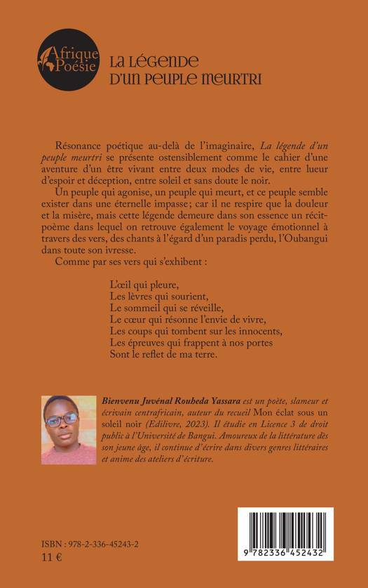 Résonnance poétique au-delà de l'imaginaire, La Légende d'un peuple meurtri se présente ostensiblement comme le cahier d'une aventure d'un être vivant entre deux modes de vie, entre lueur d'espoir et déception, entre soleil et sans doute le noir. Un peuple qui agonise, un peuple qui meurt, et ce peuple semble exister dans une éternelle impasse; car il ne respire que la douleur et la misère, mais cette légende demeure dans son essence un récit-poème dans lequel on retrouve également le voyage émotionnel à travers des vers, des chants à l'égard d'un paradis perdu, l'Oubangui dans toute son ivresse. Comme par ses vers qui s'exhibent L'oeil qui pleure, Les lèvres qui sourient, Le sommeil qui se réveille, Le coeur qui résonne l'envie de vivre, Les coups qui tombent sur les innocents, Les épreuves qui frappent à nos portes Sont le reflet de ma terre.