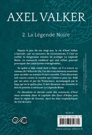 Depuis le jour de ses vingt ans, la vie d’Axel Valker a basculé : par un concours de circonstances, il s’est vu confier la dangereuse mission de protéger La Légende Noire, ce manuscrit médiéval qui, mal utilisé, pourrait provoquer des cataclysmes inimaginables.<br /> Sa quête a déjà mené Axel à Dijon où il a trouvé un rameau de l’Arbre de Vie, l’un des trois éléments essentiels pour accéder au manuscrit tant convoité. C’est désormais une course contre la montre qui s’amorce pour lui. Aidé par ses amis et par les Protecteurs, accompagné par le loup qui ne le quitte plus, il doit devancer ses ennemis et être le premier à retrouver La Légende Noire.<br /> Ce deuxième et dernier volet des aventures d’Axel nous emmène dans la capitale des Ducs d’Anjou puis dans la région de Saumur, dans les sites troglodytiques du Val de Loire.