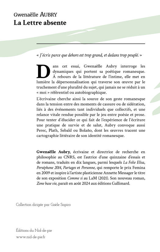 « J’écris parce que dehors est trop grand, et dedans trop peuplé. »Dans cet essai, Gwenaëlle Aubry interroge les dynamiques qui portent sa poétique romanesque. À rebours de la littérature de l’intime, elle met en lumière la dépersonnalisation qui traverse son œuvre par le truchement d’une pluralité du sujet, qui jamais ne se réduit à un « moi » référentiel ou autobiographique.L’écrivaine cherche ainsi la source de son geste romanesque dans la tension entre des moments de cassure ou de sidération, liés à des événements tant individuels que collectifs, et une relance vitale rendue possible par le jeu entre poésie et prose. Pour tenter d’élucider ce qui fait de l’expérience de l’écriture une pratique de survie et de salut, Aubry convoque aussi Perec, Plath, Sebald ou Bolaño, dont les œuvres tracent une cartographie littéraire de son identité romanesque.