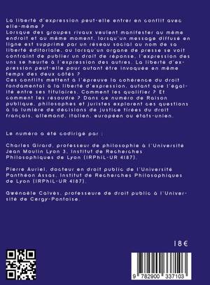 La liberté d'expression peut-elle entrer en conflit avec elle-même? Lorsque des groupes rivaux veulent manifester au même endroit et au même moment, lorsqu'un message diffusé en ligne est supprimé par un réseau social au nom de sa liberté éditoriale ou lorsqu'un organe de presse se voit contraint de publier un droit de réponse, l'expression des uns se heurte à l'expression des autres. La liberté peut-elle pour autant être invoquée en même temps des deux côtés? Ces conflits mettent à l'épreuve la cohérence du droit fondamental à la liberté d'expression, autant que l'égalité entre ses titulaires. Comment les qualifier? Et comment les résoudre? Dans ce numéro de Raison publique, philosophes et juristes explorent ces questions à la lumière de décisions de justice tirées du droit français, allemand, italien, européen ou états-unien.