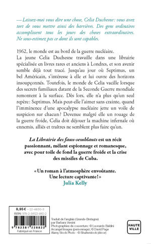 La jeune Celia Duchesne travaille dans une librairie spécialisée en livres rares et anciens à Londres, et son avenir semble déjà tout tracé. Jusqu'au jour où Septimus, un bel Américain, s'intéresse à elle et lui ouvre des horizons insoupçonnés. Toutefois, le monde de Celia vacille lorsque des secrets familiaux datant de la Seconde Guerre mondiale remontent à la surface. Dès lors, elle n'a plus qu'un seul repère : Septimus. Mais peut-elle l'aimer sans crainte, quand l'imminence d'une apocalypse nucléaire jette un voile de suspicion sur chacun ? Devenue malgré elle un rouage de la guerre froide, Celia doit déjouer la machine infernale où ennemis, alliés et traîtres ne semblent plus faire qu'un.