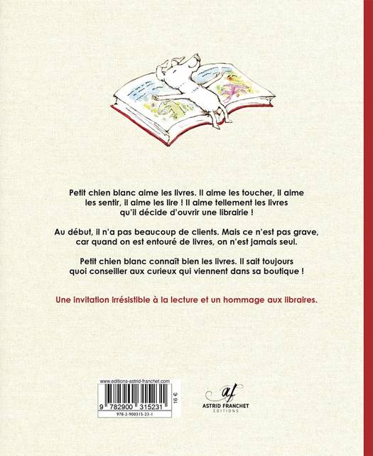 Petit chien blanc aime les livres. Il aime les toucher, il aime les sentir, il aime les lire ! Il aime tellement les livres qu’il décide d’ouvrir une librairie ! Au début, il n’a pas beaucoup de clients. Mais ce n’est pas grave, car quand on est entouré de livres, on n’est jamais seul. Petit chien blanc connaît bien les livres. Il sait toujours quoi conseiller aux curieux qui viennent dans sa boutique. Une invitation irrésistible à la lecture et un hommage aux libraires.