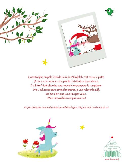 Catastrophe au pôle Nord ! Le renne Rudolph s’est cassé la patte. Avec un renne en moins, pas de distribution de cadeaux. Le Père Noël cherche une nouvelle recrue pour le remplacer. Moi, la licorne pas comme les autres, je vais relever le défi. Le hic, c’est que je ne sais pas voler… Mais impossible n’est pas licorne !