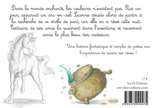Dans le monde enchanté, les couleurs n’existent pas. Puis un jour, apparait un arc-en-ciel. Licorne décide alors de partir à la recherche de ce drôle de pont, car elle en a rêvé cette nuit. Certains de ses amis la suivront dans l’aventure, et recevront ainsi le plus beau des cadeaux. Une histoire fantastique et remplie de poésie sur l’importance de suivre ses rêves !