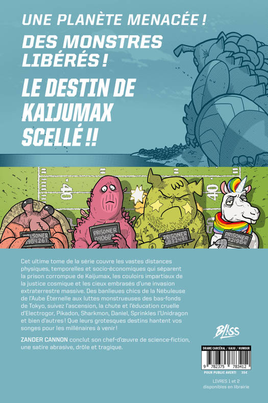 Une planète menacéeâ! Des monstres libérésâ! Le destin de Kaijumax scellé ! Cet ultime tome de la série couvre les vastes distances physiques, temporelles et socio-économiques qui séparent la prison corrompue de Kaijumax, les couloirs impartiaux de la justice cosmique et les cieux embrasés d'une invasion extraterrestre massive. Des banlieues chics de la Nébuleuse de l'Aube Éternelle aux luttes monstrueuses des bas-fonds de Tokyo, suivez l'ascension, la chute et l'éducation cruelle d'Electrogor, Pikadon, Sharkmon, Daniel, Sprinkles l'Unidragon et bien d'autresâ! Que leurs grotesques destins hantent vos songes pour les millénaires à venirâ! ZANDER CANNON conclut son chef-d'Åuvre de science-fiction, une satire abrasive, drôle et tragique.