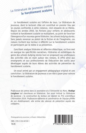 Le harcèlement scolaire est l’affaire de tous. La littérature de jeunesse, dont le lectorat cible est constitué en premier lieu par les jeunes confrontés à cette violence, s’est emparée de ce thème. Depuis les années 2010, les fictions pour enfants et adolescents traitant le harcèlement scolaire se multiplient, au point de favoriser l’émergence d’un nouveau genre littéraire  : les schools bullying stories. Sans jamais renoncer au plaisir de la fiction et de l’imaginaire, ces romans invitent leur lecteur à réfléchir sur le harcèlement scolaire et participent par là même à sa prévention.