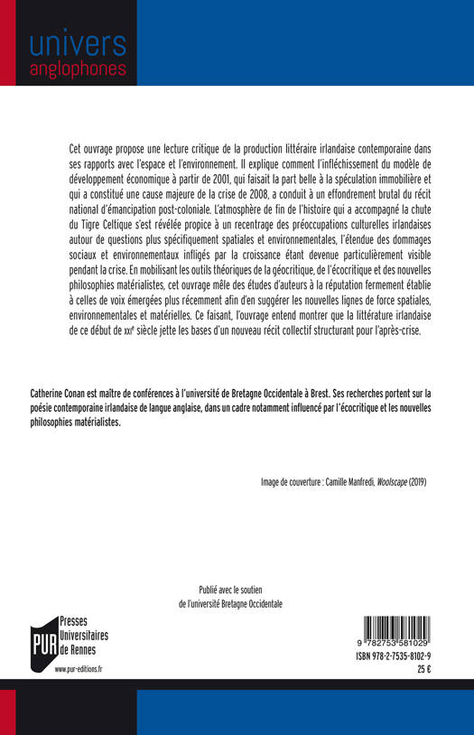 Cet ouvrage propose une lecture critique de la production littéraire irlandaise contemporaine dans ses rapports avec l'espace et l'environnement. Il explique comment l'infléchissement du modèle de développement économique à partir de 2001 a conduit à un effondrement brutal du récit national d'émancipation post-coloniale. En mobilisant les outils théoriques de la géocritique, de l'écocritique et des nouvelles philosophies matérialistes, cet ouvrage mêle des études d'auteurs à la réputation fermement établie à celles de voix émergées plus récemment afin d'en suggérer les nouvelles lignes de force spatiales, environnementales et matérielles.