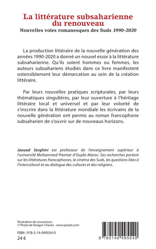 La production littéraire de la nouvelle génération des années 1990-2020 a donné un nouvel essor à la littérature subsaharienne. Qu'ils soient hommes ou femmes, les auteurs subsahariens étudiés dans ce livre manifestent ostensiblement leur démarcation au sein de la création littéraire. Par leurs nouvelles pratiques scripturales, par leurs thématiques singulières, par leur ouverture à l'héritage littéraire local et universel et par leur volonté de s'inscrire dans la littérature mondiale les écrivains de la nouvelle génération ont permis au roman francophone subsaharien de s'ouvrir sur de nouveaux horizons.