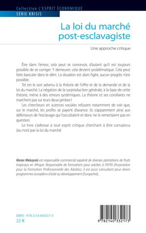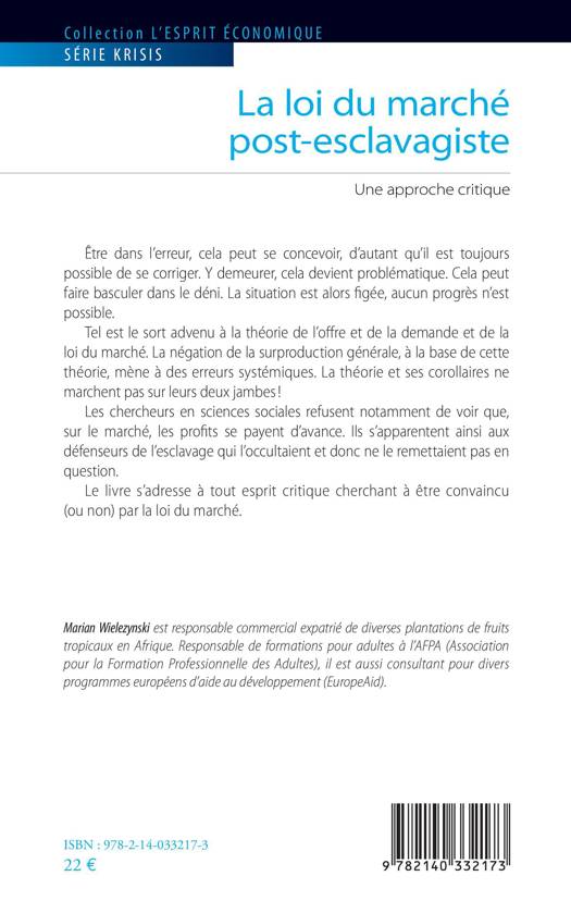 à Tel est le sort advenu à la théorie de l'offre et de la demande et de la loi du marché. La négation de la surproduction générale, à la base de cette théorie, mène à des erreurs systémiques. La théorie et ses corollaires ne marchent pas sur leurs deux jambes ! Les chercheurs en sciences sociales refusent notamment de voir que, sur le marché, les profits se payent d'avance. Ils s'apparentent ainsi aux défenseurs de l'esclavage qui l'occultaient et donc ne le remettaient pas en question. Le livre se destine à tout esprit critique cherchant à être convaincu (ou non) par la loi du marché.