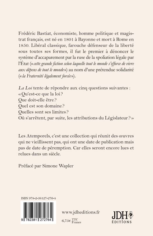Frédéric Bastiat, économiste, homme politique et magistrat français, est né en 1801 à Bayonne et mort à Rome en 1850. Libéral classique, farouche défenseur de la liberté sous toutes ses formes, il fut le premier à dénoncer le système d'accaparement par la ruse de la spoliation légale par l'État ( cette grande fiction selon laquelle tout le monde s'efforce de vivre aux dépens de tout le monde ) au nom d'une prétendue solidarité ( la Fraternité légalement forcée ). La Loi tente de répondre aux cinq questions suivantes: Qu'est-ce que la loi ? Que doit-elle être ? Quel est son domaine ? Quelles sont ses limites ? Où s'arrêtent, par suite, les attributions du Législateur ? Les Atemporels, c'est une collection qui réunit des oeuvres qui ne vieillissent pas, qui ont une date de publication mais pas de date de péremption. Car elles seront encore lues et relues dans un siècle. Préfacé par Simone Wapler