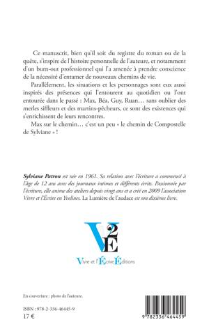 Ce manuscrit, bien qu’il soit du registre du roman ou de la quête, s’inspire de l’histoire personnelle de l’auteure, et notamment d’un burn-out professionnel qui l’a amenée à prendre conscience de la nécessité d’entamer de nouveaux chemins de vie. Parallèlement, les situations et les personnages sont eux aussi inspirés des présences qui l’entourent au quotidien ou l’ont entourée dans le passé : Max, Béa, Guy, Ruan… sans oublier des merles siffleurs et des martins-pêcheurs, ce sont des existences qui s’enrichissent de leurs rencontres. Max sur le chemin… c’est un peu « le chemin de Compostelle de Sylviane » !