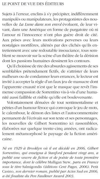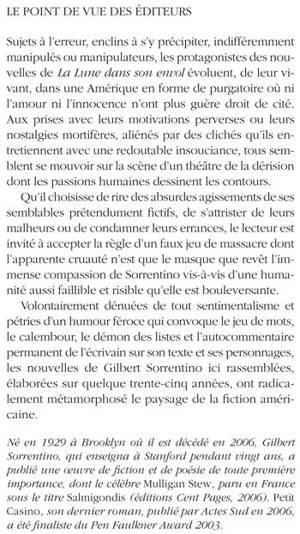 Sujets à l'erreur, enclins à s'y précipiter, indifféremment manipulés ou manipulateurs, les protagonistes des nouvelles de La Lune dans son envol évoluent, de leur vivant, dans une Amérique en forme de purgatoire où ni l'amour ni l'innocence n'ont plus guère droit de cité. Aux prises avec leurs motivations perverses ou leurs nostalgies mortifères, aliénés par des clichés qu'ils entretiennent avec une redoutable insouciance, tous semblent se mouvoir sur la scène d'un théâtre de la dérision dont les passions humaines dessinent les contours. Qu'il choisisse de rire des absurdes agissements de ses semblables prétendument fi ctifs, de s'attrister de leurs malheurs ou de condamner leurs errances, le lecteur est invité à accepter la règle d'un faux jeu de massacre dont l'apparente cruauté n'est que le masque que revêt l'immense compassion de Sorrentino vis-à-vis d'une humanité aussi faillible et risible qu'elle est bouleversante. Volontairement dénuées de tout sentimentalisme et pétries d'un humour féroce qui convoque le jeu de mots, le calembour, le démon des listes et l'autocommentaire permanent de l'écrivain sur son texte et ses personnages, les nouvelles de Gilbert Sorrentino ici rassemblées, éla borées sur quelque trente-cinq années, ont radicalement métamorphosé le paysage de la fi ction américaine.