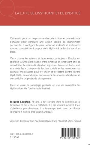 Cet essai a pour but de procurer des orientations et une méthode d'analyse pour conduire une action sociale de changement pertinente. Il configure l'espace social où institués et instituants sont en compétition à propos de la légitimité de l'ordre social en place. On y trouve les acteurs et leurs enjeux principaux. Ensuite est abordée la lutte perpétuelle entre l'institué et l'instituant afin de démythifier la notion d'institution légitimant l'autorité. Enfin, sont examinés les « champs » de l'action sociale et les ressources ou capitaux mobilisables pour s'y situer et s'y battre contre l'ordre légal établi. En conclusion, on trouvera des moyens d'élaborer et de conduire un projet de changement. C'est un essai de sociologie générale en vue de combattre les légitimations de l'ordre social institué.