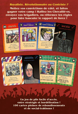 Royaliste, Révolutionnaire ou Centriste ? Mettez vos convictions de côté, et faites gagner votre camp ! Ralliez les Chevallié·es, envoyez vos brigadiers, ou réformez les règles pour faire basculer le rapport de force ! Un jeu de plis stratégique et rigolo, de 3 à 7 joueurs. Le plein d'humour féodalo-marxiste, avec 10% de stratégie, 10% de bordel, et 80% de déterminisme social. Totalement indépendant de la BD «Le Royaume aux Mille Réformes, mais parfaitement complémentaire !