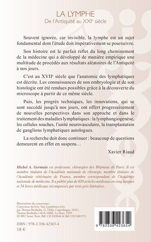 Souvent ignorée, car invisible, la lymphe est un sujet fondamental dont l'étude doit impérativement se poursuivre. Son histoire est le parfait reflet du long cheminement de la médecine qui a développé de manière empirique une multitude de procédés aux résultats aléatoires de l'Antiquité à nos jours. C'est au XVIIe siècle que l'anatomie des lymphatiques est décrite. Les connaissances de son embryologie et de son histologie ont été rendues possibles grâce à la découverte du microscope à partir de ce même siècle. Puis, les progrès techniques, les innovations, qui se sont succédé jusqu'à nos jours, ont offert progressivement de nouvelles perspectives dans son approche et dans le traitement des maladies lymphatiques: la lymphangiogenèse, les cellules souches, l'unité neurovasculaire, la transplantation de ganglions lymphatiques autologues. La recherche doit donc continuer: beaucoup de questions demeurent en effet en suspens... Xavier Riaud
