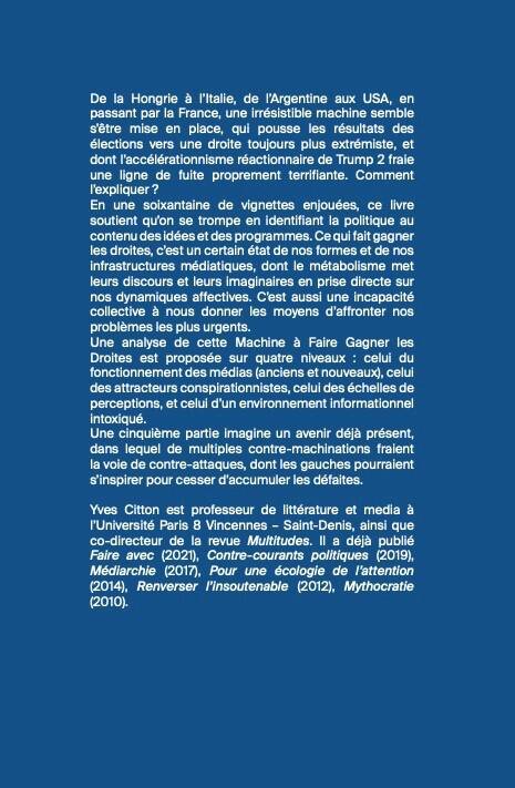 De la Hongrie à l’Italie, de l’Argentine aux USA, en passant par la France, une irrésistible machine semble s’être mise en place, qui pousse les résultats des élections vers une droite toujours plus extrémiste, et dont l’accélérationnisme réactionnaire de Trump 2 fraie une ligne de fuite proprement terrifiante. Comment l’expliquer ? En une soixantaine de vignettes enjouées, ce livre soutient qu’on se trompe en identifiant la politique au contenu des idées et des programmes. Ce qui fait gagner les droites, c’est un certain état de nos formes et de nos infrastructures médiatiques, dont le métabolisme met leurs discours et leurs imaginaires en prise directe sur nos dynamiques affectives. C’est aussi une incapacité collective à nous donner les moyens d’affronter nos problèmes les plus urgents. Une analyse de cette Machine à Faire Gagner les Droites est proposée sur quatre niveaux : celui du fonctionnement des médias (anciens et nouveaux), celui des attracteurs conspirationnistes, celui des échelles de perceptions, et celui d’un environnement informationnel intoxiqué. Une cinquième partie imagine un avenir déjà présent, dans lequel de multiples contre- machinations fraient la voie de contre-attaques, dont les gauches pourraient s’inspirer pour cesser d’accumuler les défaites.