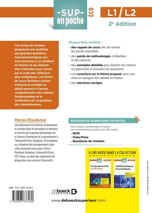 Ces fiches de révision proposent une synthèse des grandes questions macroéconomiques qui sont soumises à un étudiant en licence et qui doivent être maitrisées pour mener par la suite des réflexions plus analytiques. Les ?ches de cours illustrées suivies d’exercices corrigés en détail assurent la bonne compréhension des notions fondamentales et la véri?cation de l’acquisition des connaissances.