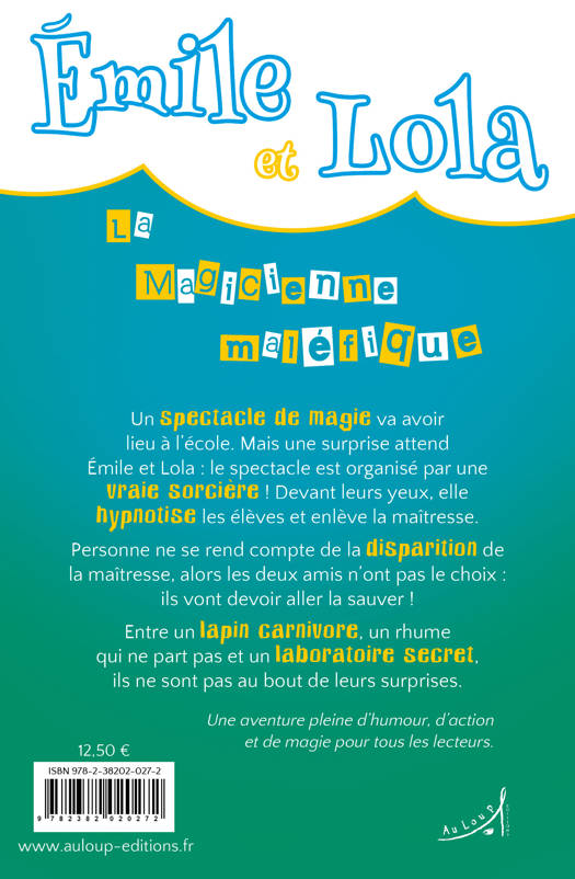 Un spectacle de magie va avoir lieu à l’école. Mais une surprise attend Émile et Lola : le spectacle est organisé par une vraie sorcière ! Devant leurs yeux, elle hypnotise les élèves et enlève la maîtresse.<br /><br /><br /> Personne ne se rend compte de la disparition de la maîtresse, alors les deux amis n’ont pas le choix : ils vont devoir aller la sauver !<br /><br /><br /> Entre un lapin carnivore, un rhume qui ne part pas et un laboratoire secret, ils ne sont pas au bout de leurs surprises.<br /><br /><br /> <br /><br /><br /> Une aventure pleine d’humour, d’action et de magie pour tous les lecteurs.