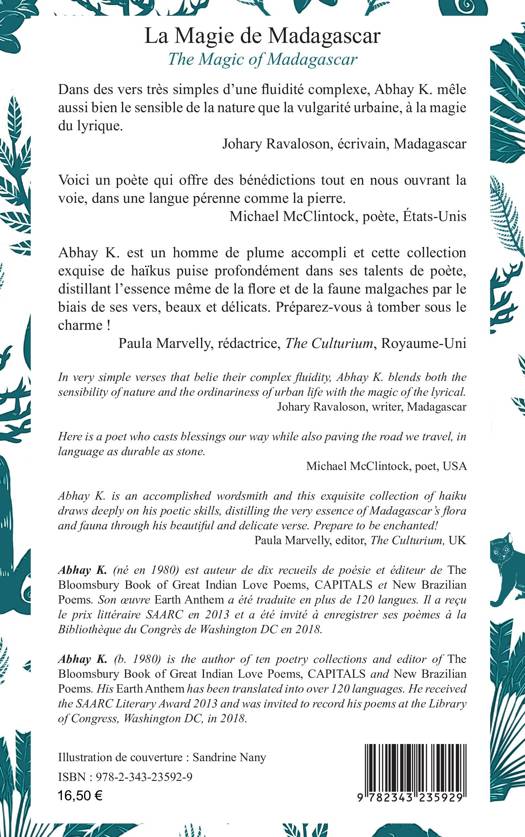 Abhay K. is an accomplished wordsmith and this exquisite collection of haiku draws deeply on his poetic skills, distilling the very essence of Madagascar's flora and fauna through his beautiful and delicate verse. Prepare to be enchanted !
