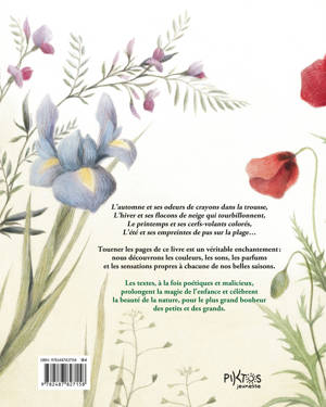 Automne, hiver, printemps, été… chaque saison s’accompagne de ses odeurs, de ses bruits, de ses saveurs et nous offre des sensations et des émotions bien particulières. Cet ouvrage, à travers autant de petites poésies, célèbre les beautés de chacune. À lire à haute voix ou à murmurer, les petits textes accentuent la magie et la beauté des illustrations tout en traduisant en mots les sensations : la chaleur du vent d’été, le murmure des feuilles d’automne, le crissement de la neige en hiver…