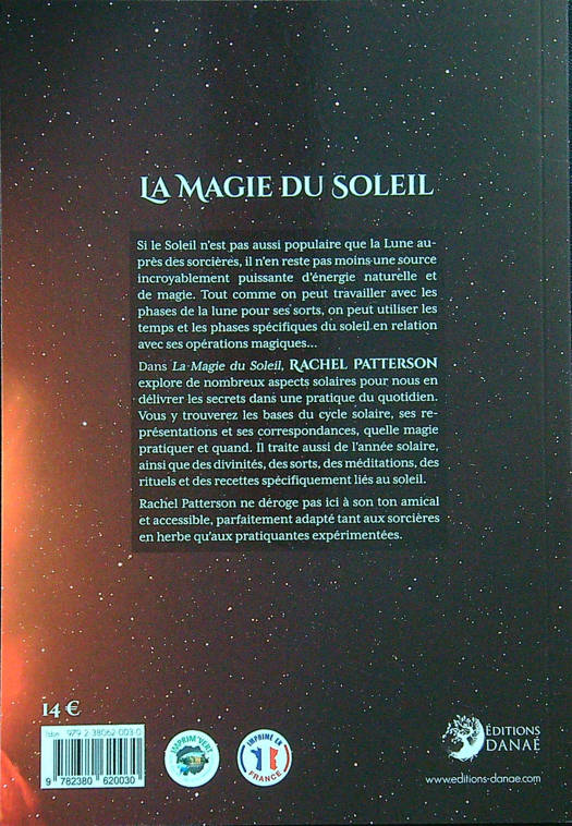 Si le Soleil n’est pas aussi populaire que la Lune auprès des sorcières, il n’en reste pas moins une source incroyablement puissante d’énergie naturelle et de magie. Tout comme on peut travailler avec les phases de la lune pour ses sorts, on peut utiliser les temps et les phases spécifiques du soleil en relation avec ses opérations magiques… Dans La Magie du Soleil, Rachel Patterson explore de nombreux aspects solaires pour nous en délivrer les secrets dans une pratique du quotidien. Vous y trouverez les bases du cycle solaire, ses représentations et ses correspondances, quelle magie pratiquer et quand. Il traite aussi de l’année solaire, ainsi que des divinités, des sorts, des méditations, des rituels et des recettes spécifiquement liés au soleil. Rachel Patterson ne déroge pas ici à son ton amical et accessible, parfaitement adapté tant aux sorcières en herbe qu’aux pratiquantes expérimentées.