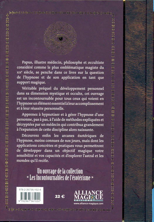 Papus, illustre médecin, philosophe et occultiste considéré comme le plus emblématique magiste du xixe siècle, se penche dans ce livre sur la question de l’hypnose et de son application en tant que support magique. Véritable préquel du développement personnel dans sa dimension mystique et occulte, cet ouvrage est un incontournable pour tous ceux qui voient en l’hypnose un élément essentiel à leur accomplissement et à leur réussite personnelle. Apprenez à hypnotiser et à gérer l’hypnose d’une personne, pas à pas, à l’aide de méthodes expliquées et décryptées par un médecin qui contribua grandement à l’expansion de cette discipline alors naissante. Découvrez enfin les arcanes ésotériques de l’hypnose, moins connues de nos jours, mais dont les applications concrètes et pratiques vous permettront de développer dans un objectif magique votre sensibilité et vos capacités et d’explorer l’astral et les mondes qu’il recèle. Un ouvrage de la collection « Les Incontournables de l’ésotérisme »