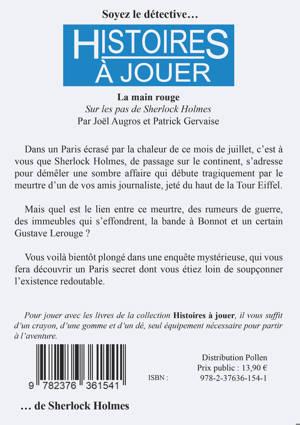 Dans un Paris écrasé par la chaleur de ce mois de juillet, c'est à vous que Sherlock Holmes, de passage sur le continent, s'adresse pour démêler une sombre affaire qui débute tragiquement par le meurtre d'un de vos amis journaliste, jeté du haut de la Tour Eiffel. <br /><br /><br /><br /> Mais quel est le lien entre ce meurtre, des rumeurs de guerre, des immeubles qui s'effondrent, la bande à Bonnot et un certain Gustave Lerouge ? <br /><br /><br /><br /> Vous voilà bientôt plongé dans une enquête mystérieuse, qui vous fera découvrir un Paris secret dont vous étiez loin de soupçonner l'existence redoutable.