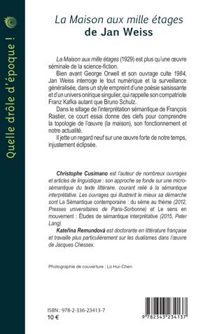 La Maison aux mille étages (1929) est plus qu’une oeuvre séminale de la science-fiction. Bien avant George Orwell et son ouvrage culte 1984, Jan Weiss interroge le tout numérique et la surveillance généralisée, dans un style empreint d’une poésie saisissante et d’un univers onirique singulier, qui rappelle son compatriote Franz Kafka autant que Bruno Schulz. Dans le sillage de l’interprétation sémantique de François Rastier, ce court essai donne des clefs pour comprendre la topologie de l’oeuvre (la maison), son fonctionnement et notre actualité. Il jette un regard neuf sur une oeuvre forte de notre temps, injustement éclipsée.