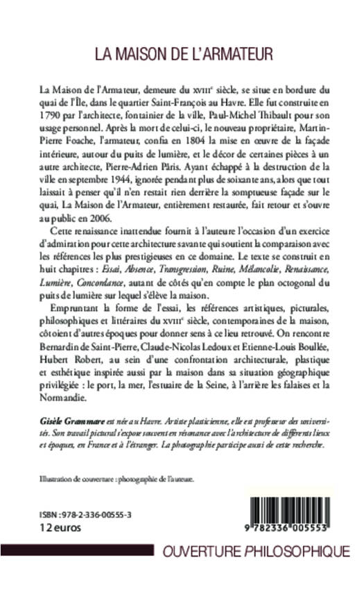 La Maison de l'Armateur, demeure du XVIIIe siècle, se situe en bordure du quai de l'Île, au Havre. Elle fut construite en 1790 par l'architecte Paul-Michel Thibault, pour son usage personnel. Ayant échappé à la destruction de la ville en septembre 1944, elle fut ignorée pendant plus de 60 ans, jusqu'à son ouverture au public en 2006. Empruntant la forme de l'essai, les références artistiques, picturales, philosophiques et littéraires du XVIIIe siècle, contemporaines de la maison, côtoient d'autres époques pour donner sens à ce lieu retrouvé.