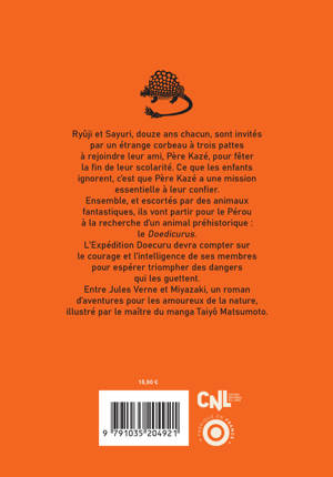 Ryûji et Sayuri, douze ans chacun, sont invités par un étrange corbeau à trois pattes à rejoindre leur ami, Père Kazé, pour fêter la fin de leur scolarité. Ce que les enfants ignorent, c'est que Père Kazé a une mission essentielle à leur confier. Ensemble, et escortés par des animaux fantastiques, ils vont partir pour le Pérou à la recherche d'un animal préhistorique : le Doedicurus. L'Expédition Doecuru devra compter sur le courage et l'intelligence de ses membres pour espérer triompher des dangers qui les guettent. Entre Jules Verne et Miyazaki, un roman d'aventures pour les amoureux de la nature, illustré par le maître du manga Taiyô Matsumoto.