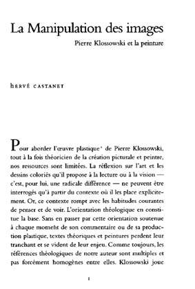 Pour aborder l'œuvre plastique de Pierre Klossowski, tout à la fois théoricien de la création picturale et peintre, Hervé Castanet passe par le dépliage des méandres d'une manipulation des images où se nouent et se dénouent corps et représentations, théologie dogmatique et travaux pratiques sexuels.
