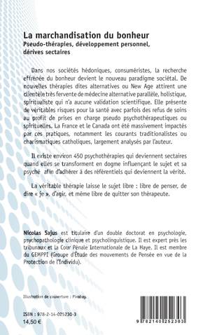Dans nos sociétés hédoniques, consuméristes, la recherche effrénée du bonheur devient le nouveau paradigme sociétal. De nouvelles thérapies dites alternatives ou New Age attirent une clientèle très fervente de médecine alternative parallèle, holistique, spiritualiste qui n'a aucune validation scientifique. Elle présente de véritables risques pour la santé avec parfois des refus de soins au profit de prises en charge pseudo psychothérapeutiques ou spirituelles. Il existe environs 450 psychothérapies qui deviennent sectaires quand elles se transforment en dogme influençant le sujet et sa psyché afin d'adhérer à des référentiels qui deviennent la vérite. La véritable thérapie laisse le sujet libre : libre de penser, de dire "je", d'agir, et même libre de quitter son thérapeute.