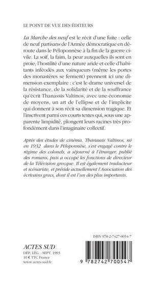 «La Marche des neuf» est le récit d'une fuite : celle de neuf partisans de l'Armée démocratique en déroute dans le Péloponnèse à la fin de la guerre civile. La soif, la faim, la peur dont ils sont la proie, l'hostilité d'une nature aride et celle d'habitants inféodés aux vainqueurs (même les portes des monastères se ferment) prennent ici une dimension exemplaire : c'est le drame universel de la résistance, de la solidarité et de la souffrance qu'écrit Thanassis Valtinos, avec une économie de moyens, un art de l'ellipse et de l'implicite qui donnent à son récit sa dimension tragique. Et l'inscrivent parmi ces courts textes qui, sous une apparente limpidité, plongent leurs racines très profondément dans l'imaginaire collectif.