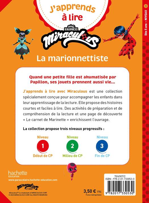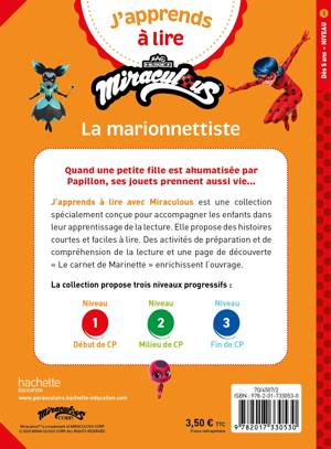 Quand une petite fille est akumatisée par Papillon, ses jouets prennent aussi vie… J’apprends à lire avec Miraculous est une collection spécialement conçue pour accompagner les enfants dans leur apprentissage de la lecture. Elle propose des histoires courtes et faciles à lire. Des activités de préparation et de compréhension de la lecture et une page de découverte « Le carnet de Marinette » enrichissent l’ouvrage.