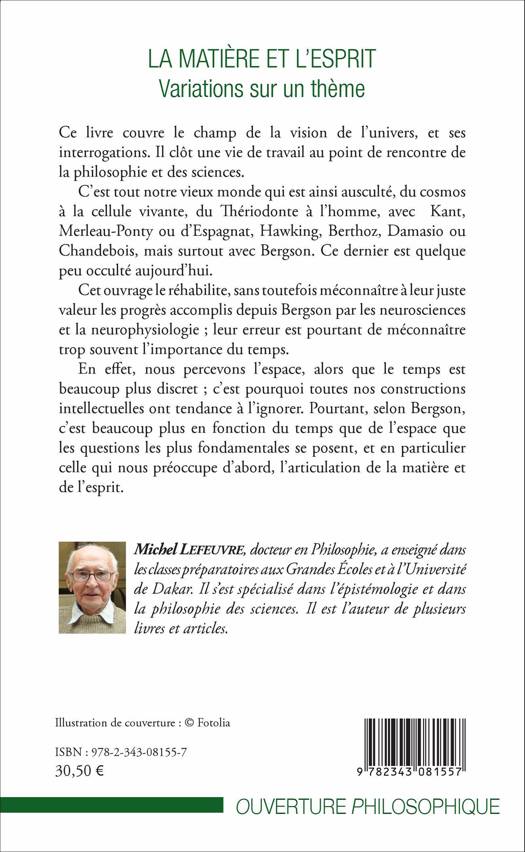 Ce livre clôt une vie de travail au point de rencontre de la philosophie et des sciences. C'est tout notre vieux monde qui est ainsi ausculté, du cosmos à la cellule vivante, du Thériodonte à l'homme, avec Kant, Merleau-Ponty ou d'Espagnat, Hawking, Berthoz, Damasio ou Chandebois, mais surtout avec Bergson. Ce dernier est quelque peu occulté aujourd'hui. Cet ouvrage le réhabilite, sans toutefois méconnaître les progrès accomplis depuis Bergson par les neurosciences et la neurophysiologie.