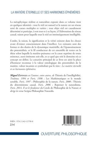 Ce livre est une contribution au renouveau de la philosophie de la nature conçue comme la recherche d'intelligibilité. D'après cette pensée réaliste, l'ordre, la raison, la signification et la vérité existent dans les choses avant d'exister consciemment dans l'intellect. Les existants sont des formes et des durées de la dynamique matérielle ; ils sont l'épanouissement des potentialités de la matière. Ce livre défend que la matière est la cause suprême de toute existence, y compris de l'esprit.