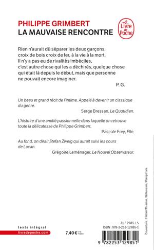 Rien n'aurait dû séparer les deux garçons, croix de bois croix de fer, à la vie à la mort. Il n'y a pas eu de rivalités imbéciles, c'est autre chose qui les a déchirés, quelque chose qui était là depuis le début, mais que personne ne pouvait encore imaginer. P. G.Par l'auteur d'Un secret.Un beau et grand récit de l'intime. Appelé à devenir un classique du genre. Serge Bressan, Le Quotidien.Philippe Grimbert [...] publie aujourd'hui La Mauvaise Rencontre l'histoire d'une amitié passionnelle dans laquelle on retrouve toute sa délicatesse. Pascale Frey, Elle.Au fond, on dirait Stefan Zweig qui aurait suivi les cours de Lacan. Grégoire Leménager, Nouvel Observateur.
