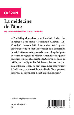 Conférence fictive, ce recueil traite autant de la mort, de la douleur, du chagrin, des affects ou du bonheur qui promet la vertu. En deuil de sa fille, Cicéron s'exhorte lui-même à surmonter la mort et la peine par la réflexion et la maîtrise de soi. Souffrance physique et souffrance morale étant étroitement liées, nous proposons ici une nouvelle traduction du livre III des fameuses «Tusculanes». En disciple des stoïciens, le célèbre orateur prône la fermeté et la force de caractère pour nous dire que la philosophie reste la meilleure médecine de l'âme.