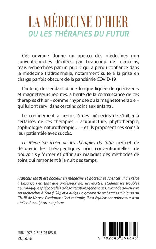 Cet ouvrage donne un aperçu des médecines non conventionnelles décriées par beaucoup de médecins, mais recherchées par un public qui a perdu confiance dans la médecine traditionnelle, notamment suite à la prise en charge parfois obscure de la pandémie COVID-19. L'auteur, descendant d'une longue lignée de guérisseurs et magnétiseurs réputés, a hérité de la connaissance de ces thérapies d'hier, comme l'hypnose ou la magnétothérapie, qui lui ont servi dans certains soins aux enfants. Le confinement a permis à des médecins de s'initier à certaines de ces thérapies, acupuncture, phytothérapie, sophrologie, naturothérapie..., et ils proposent ces soins à leur patientèle avec succès. La Médecine d'hier ou les thérapies du futur permet dendécouvrir les thérapeutiques non conventionnelles, de pouvoir s'y former et offrir aux maladies des méthodes de soins qui remontent à la nuit des temps.